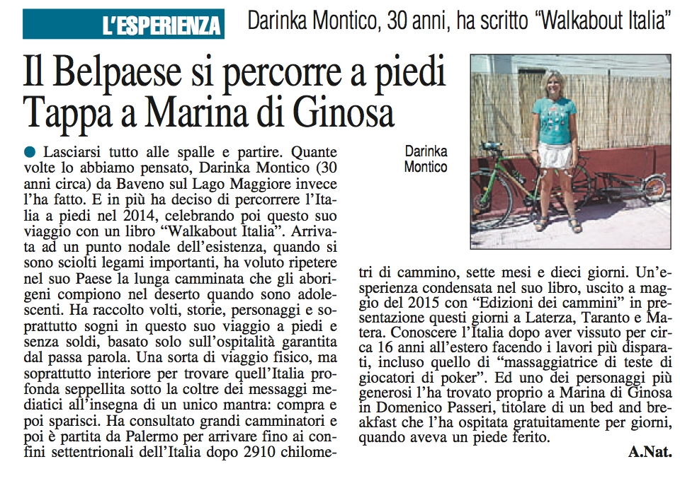 | Darinka Montico, 30 anni circa, ha percorso 2.910 chilometri a piedi. Ora è in giro per l'Italia con una bicicletta in bambù per promuovere il suo libro: "Walkabout Italia". |